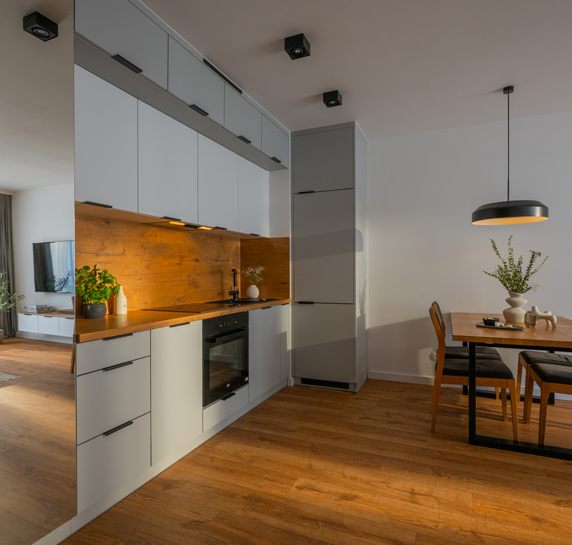 Autorskie meble powstające w naszej własnej stolarni pozwalają nam zachować pełną kontrolę nad jakością, estetyką i spójnością wykończenia wnętrz.